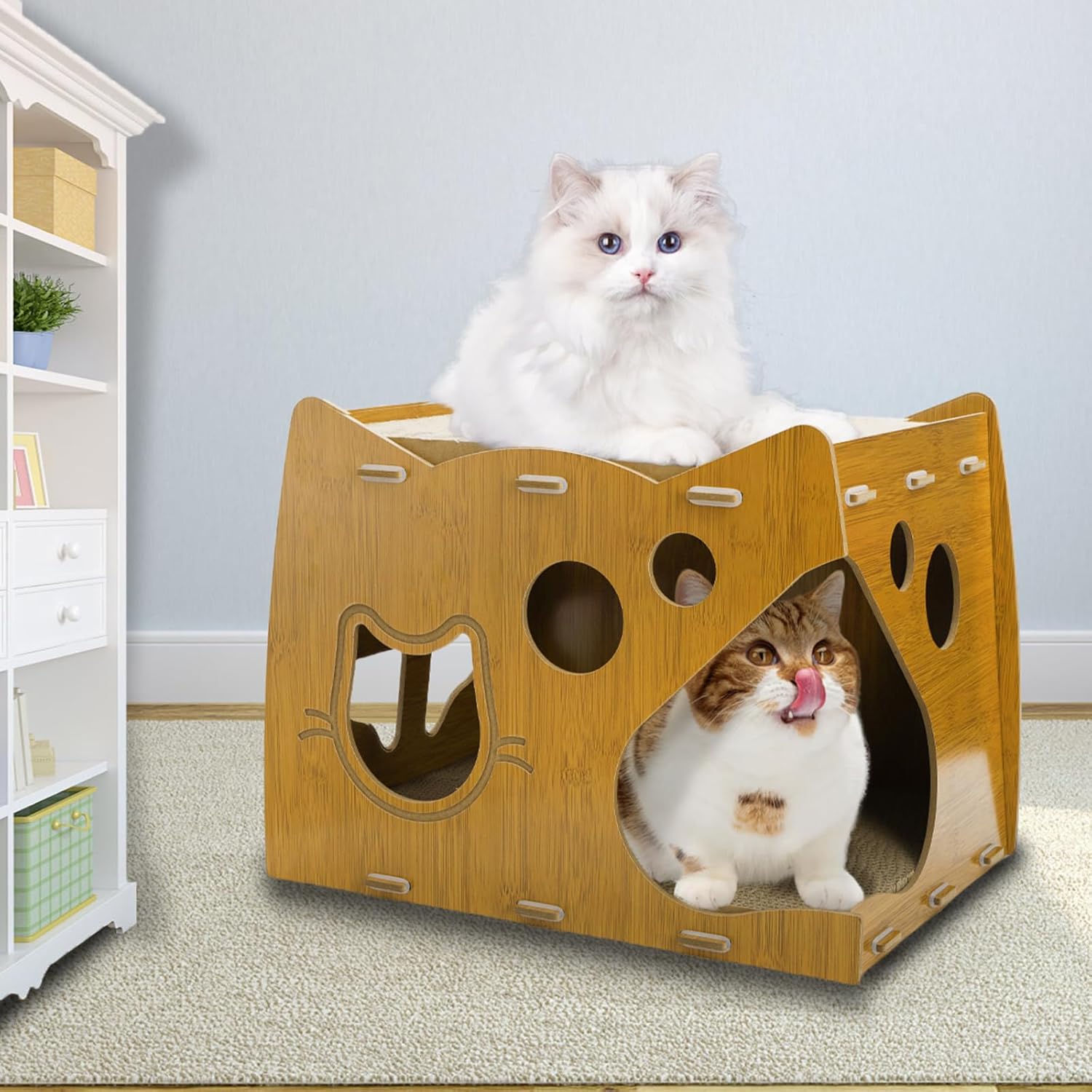 Cozy Cat Haven: With a cute house shape, our cat cardboard house instantly attracts your fur baby and provides a strong sense of home security. 2 in 1 luxury cat getaway villa caters to their diverse needs, like restful naps or exciting adventures