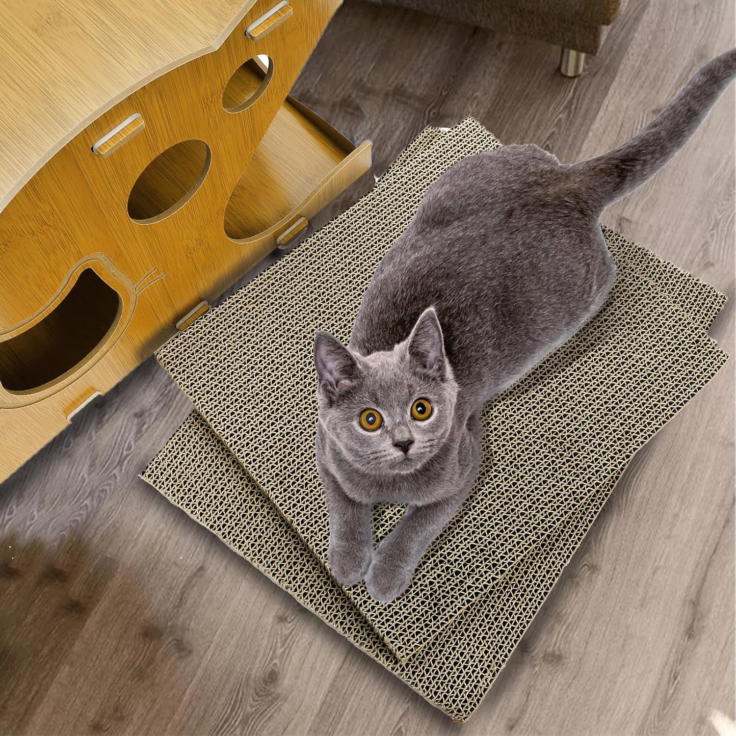 Sturdy and Safe Cardboard: Our cat scratchers for indoor is crafted from recycled corrugated cardboard, non-toxic, no bad smell. 0.8″ thickened and high density makes it strong and durable enough, not drop paper scraps