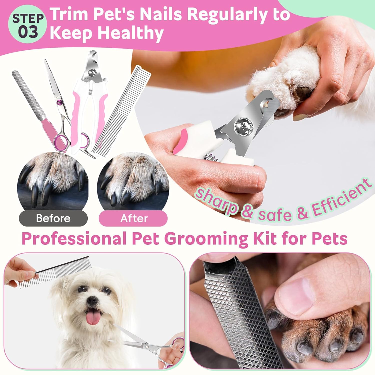10Pcs Professional Pet Grooming Tools Kit – The kit includes 1 * self cleaning shedding brush, 1 * pet grooming rake, 1 * dog nail trimmers, 1* nail clipper,1* dog shampoo brush, 2* pet hair remover gloves, 1* flea comb, 1* dog scissors for grooming, 1* pet comb. Perfect solution for your pet’s grooming needs and helping your home stay free from pet hair. A must-have grooming tool.