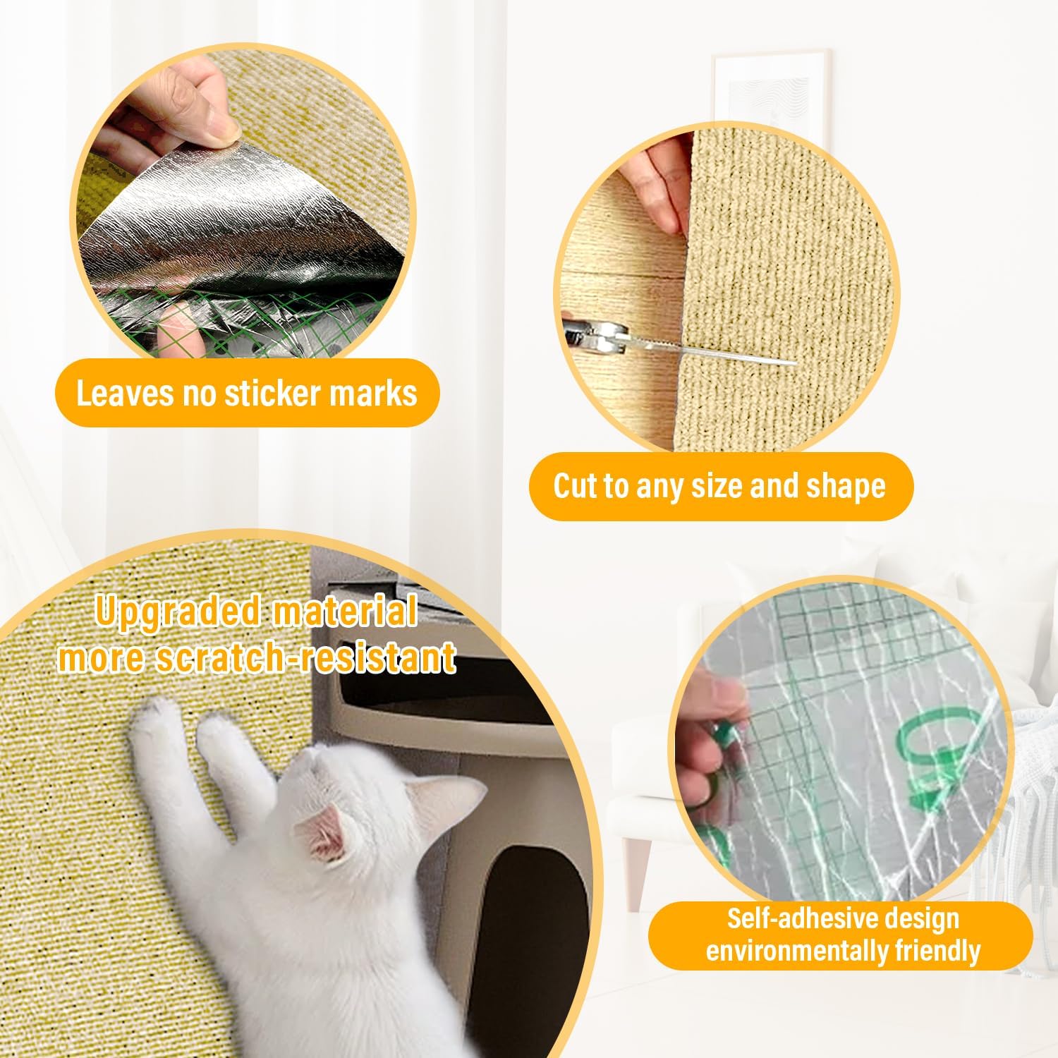 【Flexible cutting, applicable to multiple scenarios】The adhesive cat scratching mat can be freely cut to fit irregular areas such as corners, cabinet edges, and door frames. The adhesive backing can be peeled off and stuck on, making it easy to attach to wood, tile, and glass surfaces!