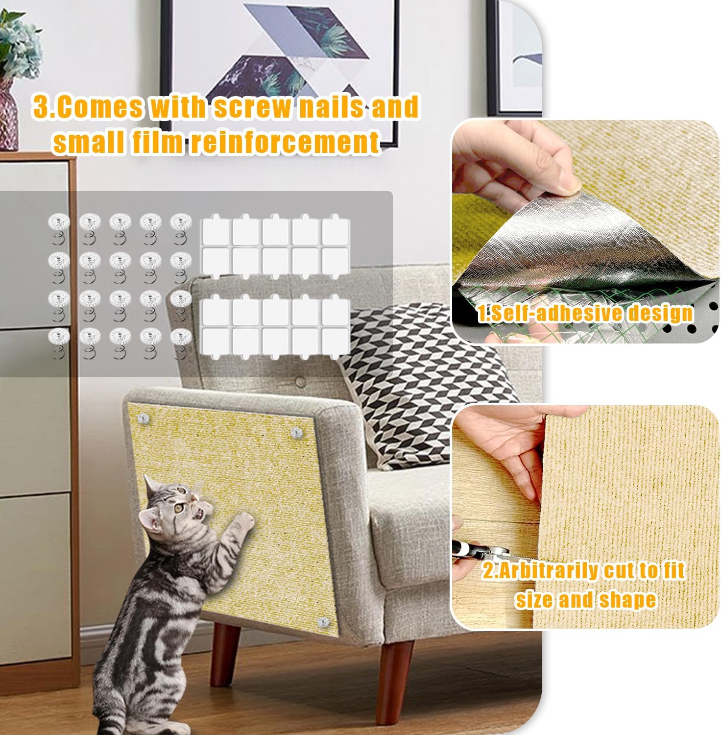 【Extra-large size Cat Scratch Furniture Protector】The cat scratch mat has an extremely large area of 118.5 inches x 17.4 inches, which can easily cover sofas, table legs and other furniture. Equipped with 20 spiral nails + 20 pieces of strong film for double reinforcement, the cat scratch mat is more stable and less likely to fall off. Even if the cat scratches crazily, it won’t shift!