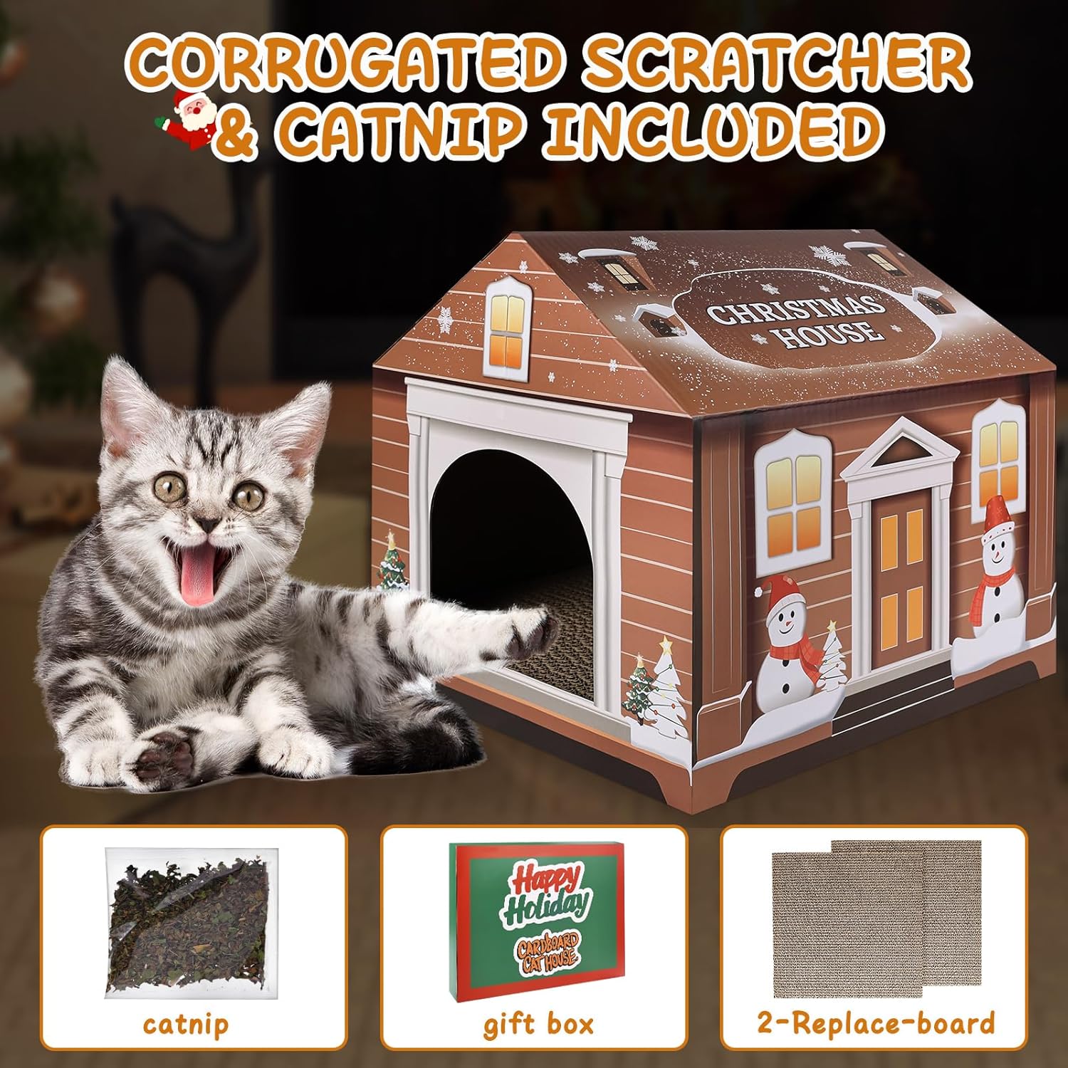 Multi-functional design: 3-in-1 design of the cardboard cat house, which not only provides a perrrfect resting place for pets but also includes Two cat scratching boards and catnip, allowing your cat to enjoy the fun of the cat scratcher house