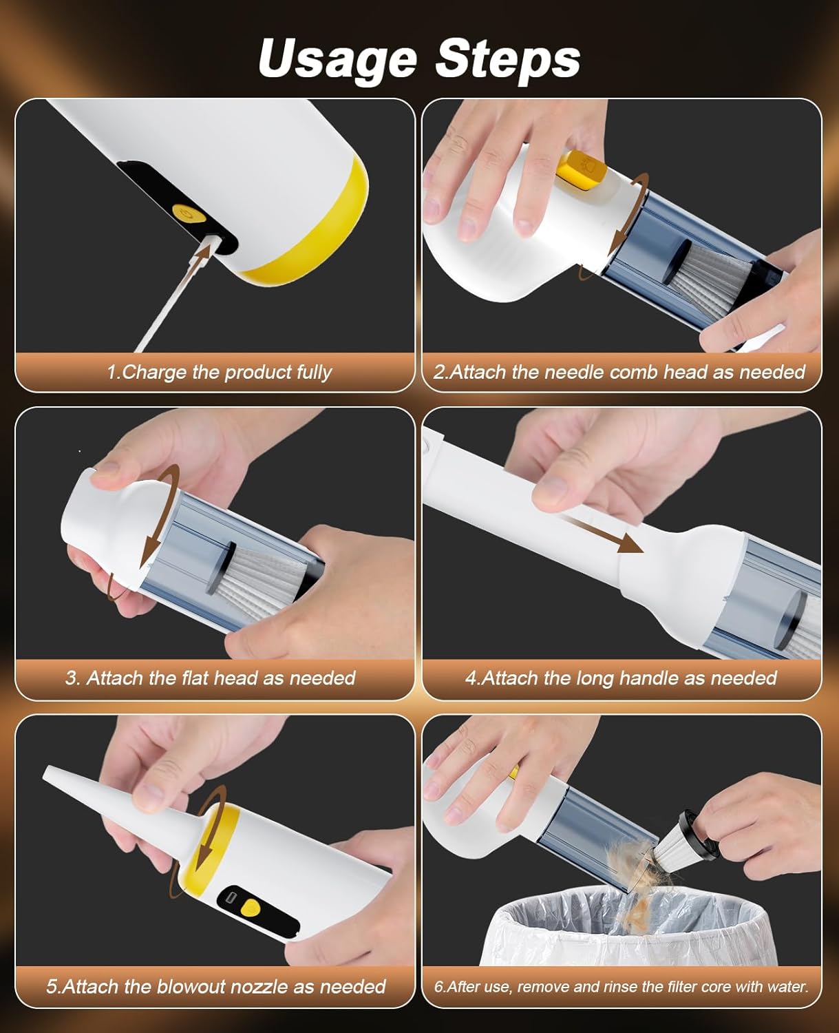 【Vacuum, Comb, and Blow in One】This Handheld Mini Pet Vacuum Cleaner features a 3-in-1 design combining suction, combing, and blowing. Beyond hair removal, it includes a comb attachment for simultaneous grooming and suction. The end can also attach the included nozzle to function as a hair dryer. This triple functionality eliminates pet hair cleanup challenges.