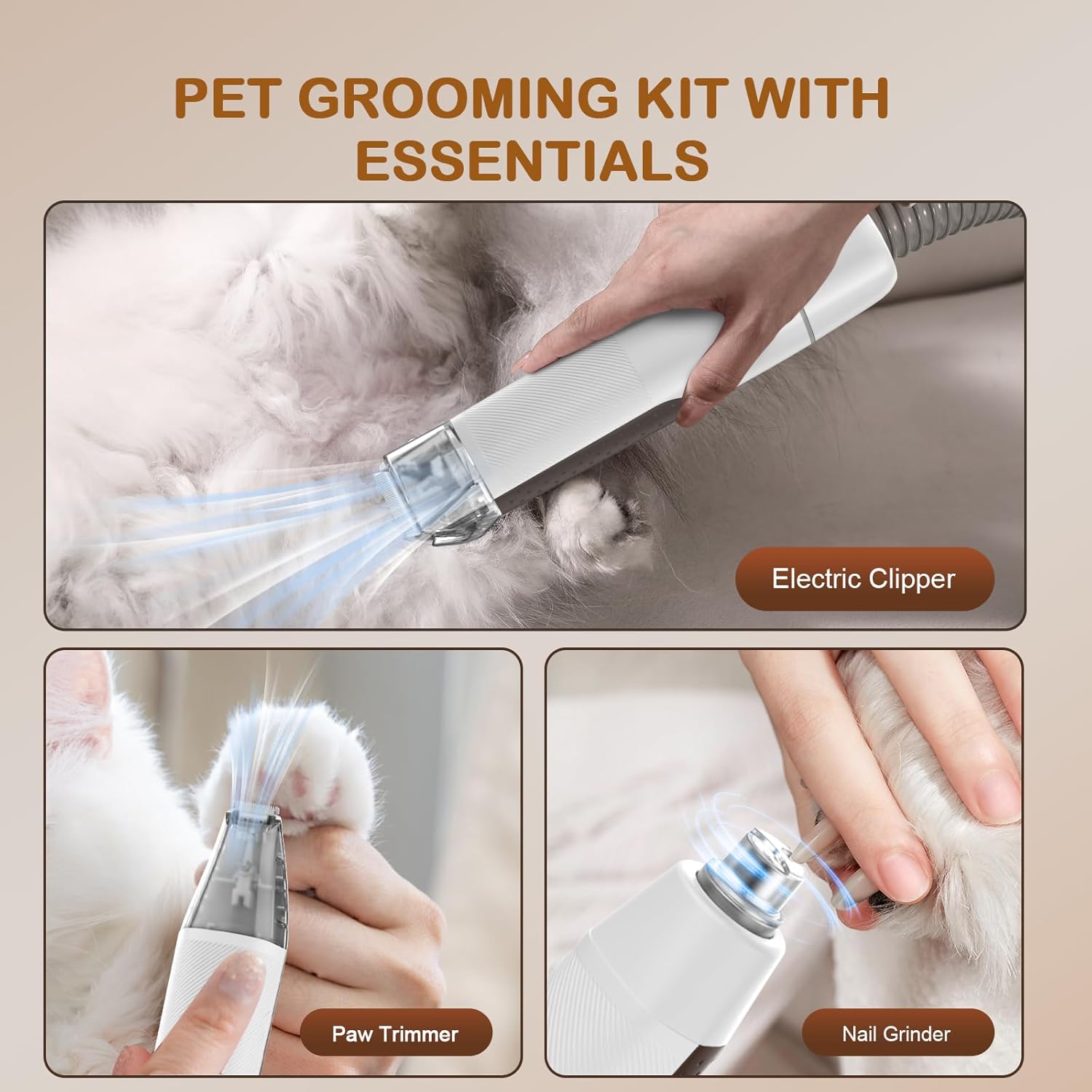 🐈7-in-1 Pro Pet Grooming Kit: Complete with perfect accessories for comprehensive pet grooming.Suction and grooming all in one, pet grooming clippers and suction function work simultaneously to remove pet hair and fine dust, keeping everything neat. The Dog paw trimmer and Nail grinder provide excellent cutting, while the Nozzle head offers deep cleaning by effectively sucking out loose hair and dandruff from sofa crevices and carpets.