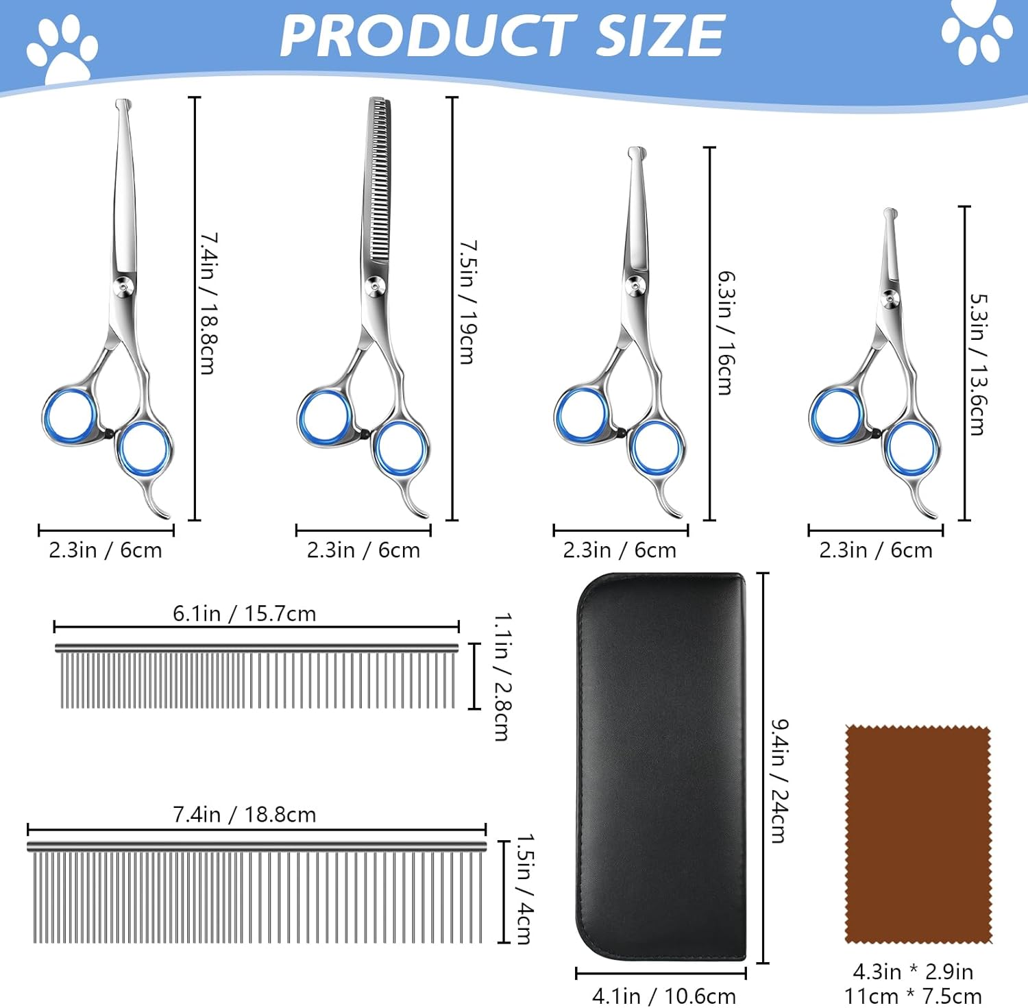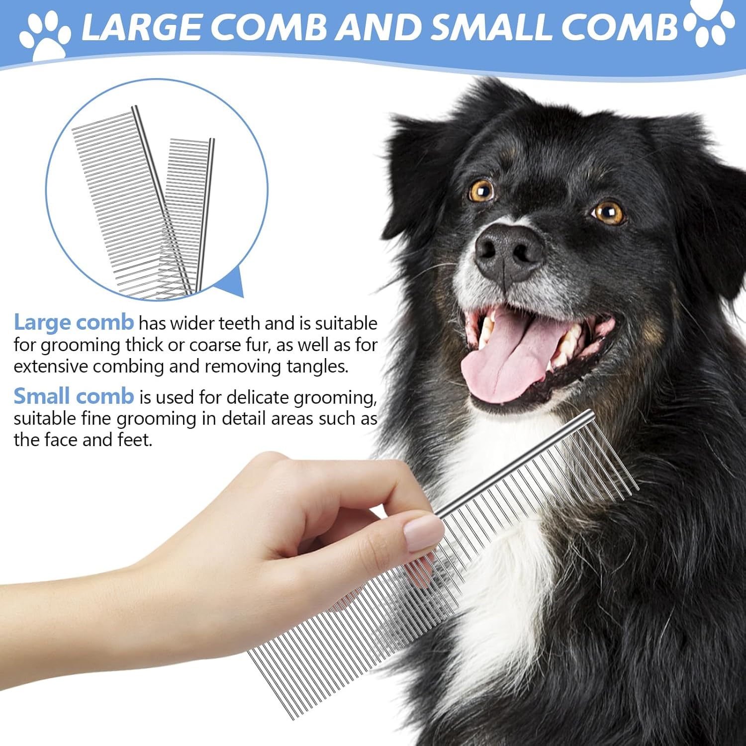 Professional Kit: Large scissors are usually used for general body trimming, straight cutting, and neat shaping. Small scissors are suitable for narrow areas, and delicate trimming of sensitive areas, such as around the feet, legs, and eyes. Large comb has wider teeth and is suitable for grooming thick or coarse fur, as well as for extensive combing and removing tangles. Small comb is used for delicate grooming, suitable fine grooming in detail areas such as the face and feet.