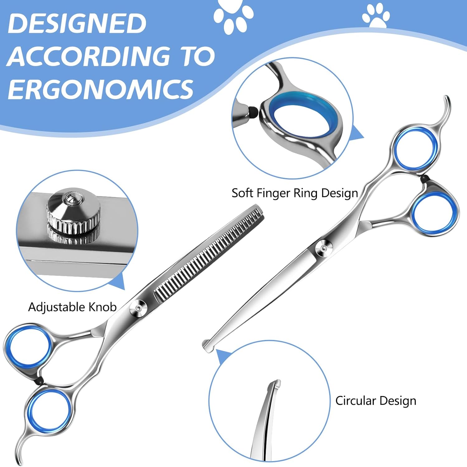 Soft Finger Ring Design: The grooming scissors kit features soft silicone rings on the finger holes to provide a comfortable grip and enhance finger friction, ensuring better control over the scissors’ movements and direction. This ergonomic design not only reduces hand fatigue during extended use but also improves work efficiency while minimizing hand strain.
