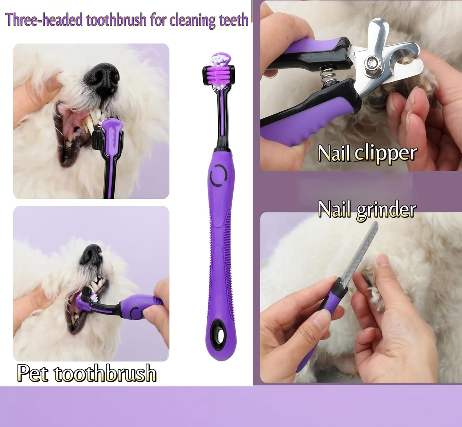 【Premium Materials | Safe & Durable】 All tools are crafted with food-grade stainless steel, rust-resistant coating, and ergonomic designs, ensuring safety and comfort during pet grooming. For example: Pet Nail Clippers feature high-hardness steel blades for smooth cutting without slippage; Stainless Steel Teeth Comb effectively removes dead hair, reducing shedding issues; Pet Tooth Brush with ultra-soft bristles gently protects pets’ oral health.