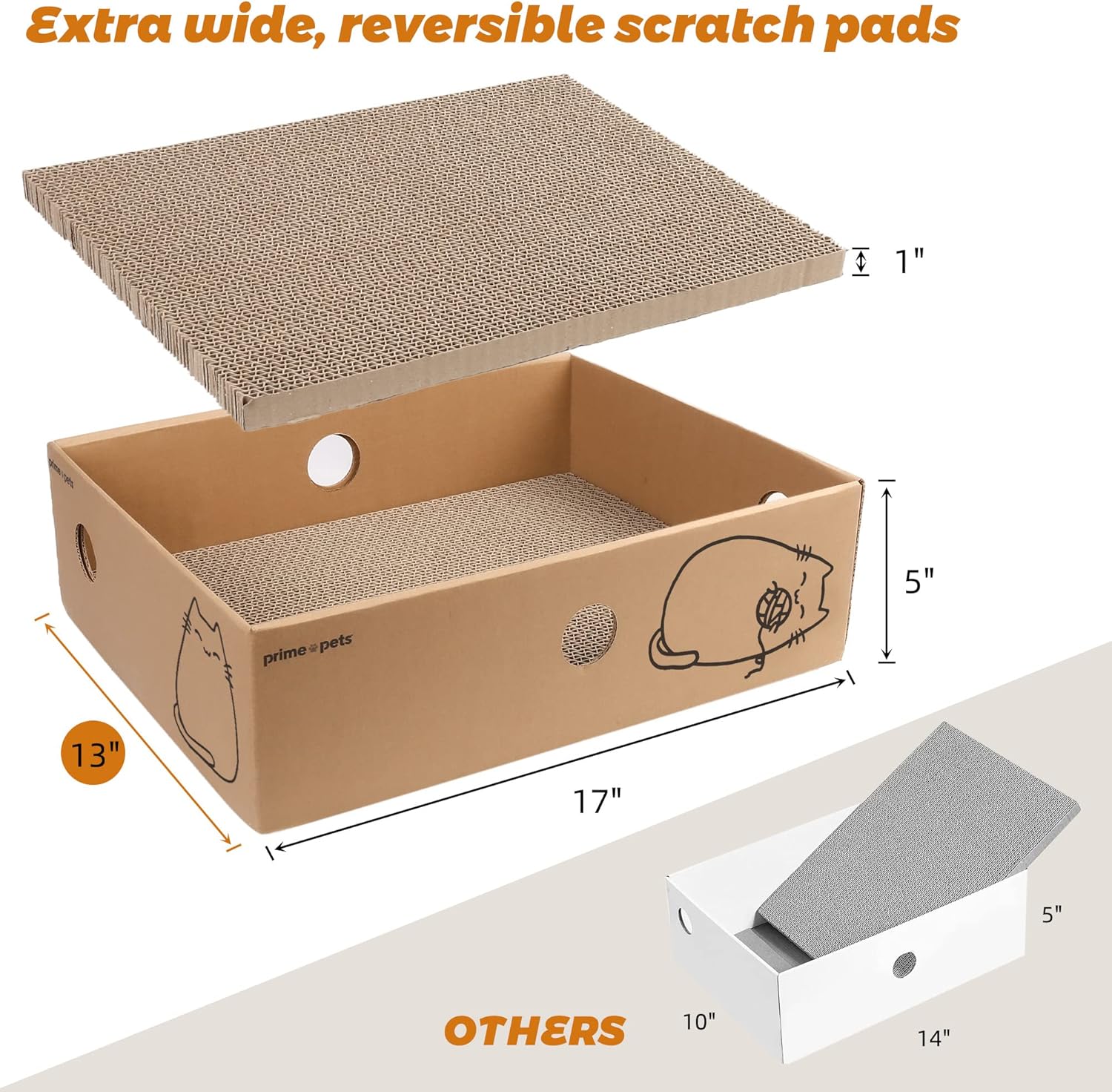 Wide Cat Scratch Box: Box size is 17’’ L x 13’’ W x 5’’ H; 5 pcs of 1” thick cat scratching pads with box frame; Box catches cardboard bits that are broken off by your cat; Also doubles as a bed for lounging and resting