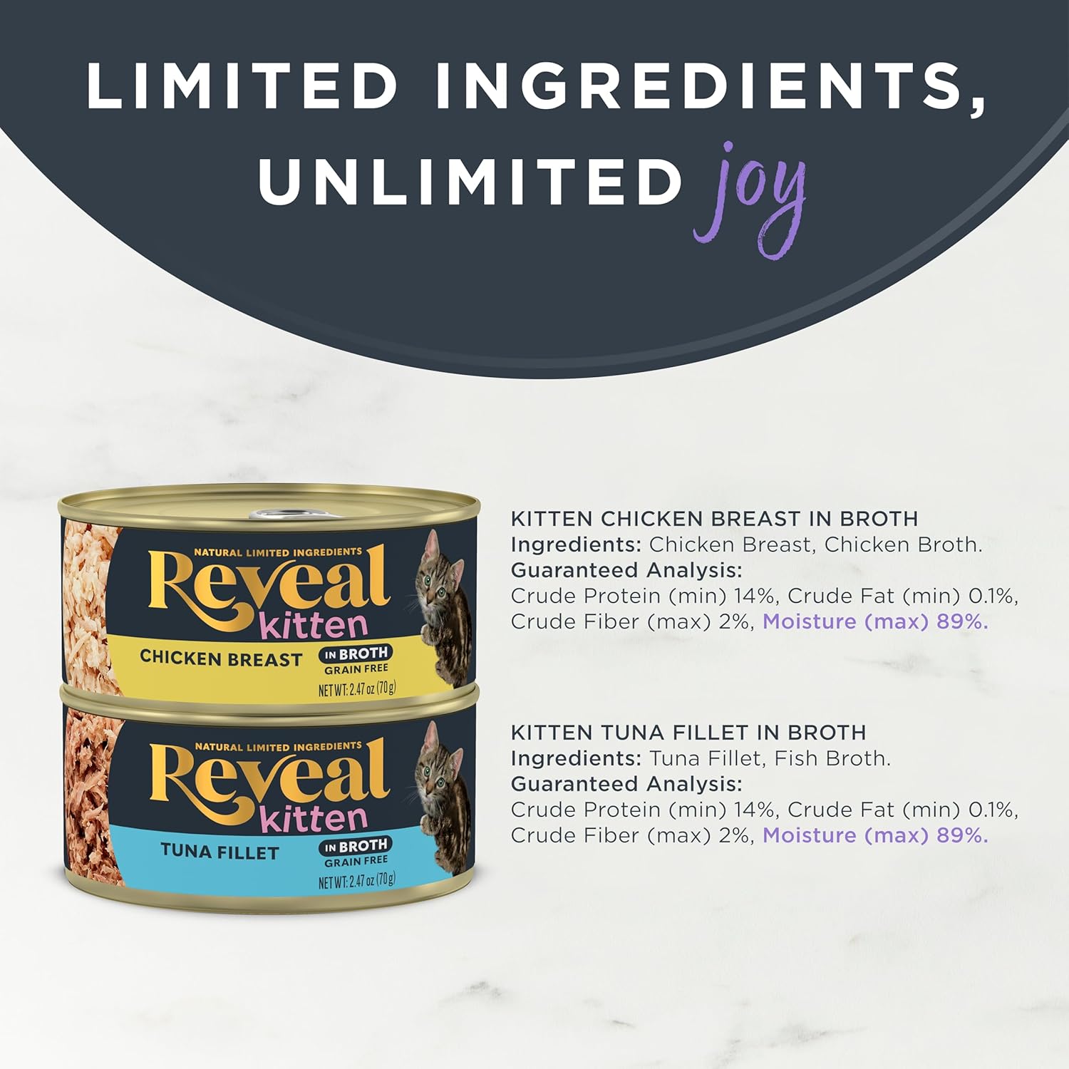 Reveal Natural Wet Kitten Food, Limited and Natural Ingredients, Grain Free, High Protein with No Artificial Additives, Chicken & Tuna Variety in Broth (8 x 2.47 oz Cans)